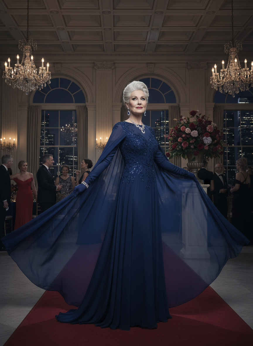 For women over 50, this style is particularly flattering because the cape drapes gracefully over the arms and shoulders, creating an elongated silhouette that feels luxurious and commanding at the same time.