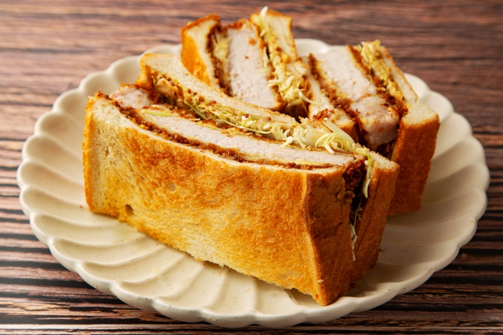 Soft Japanese milk bread, called shokupan, wraps around a thick, golden, panko-breaded pork or chicken cutlet.