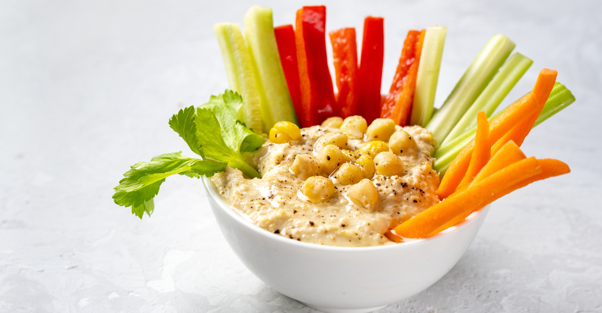 Hummus made from chickpeas provides plant-based protein, healthy fats, and complex carbohydrates. The tahini in hummus contains magnesium and calcium that support relaxation and sleep. Cut your veggies ahead of time and store them in water to keep them crisp and ready to grab.