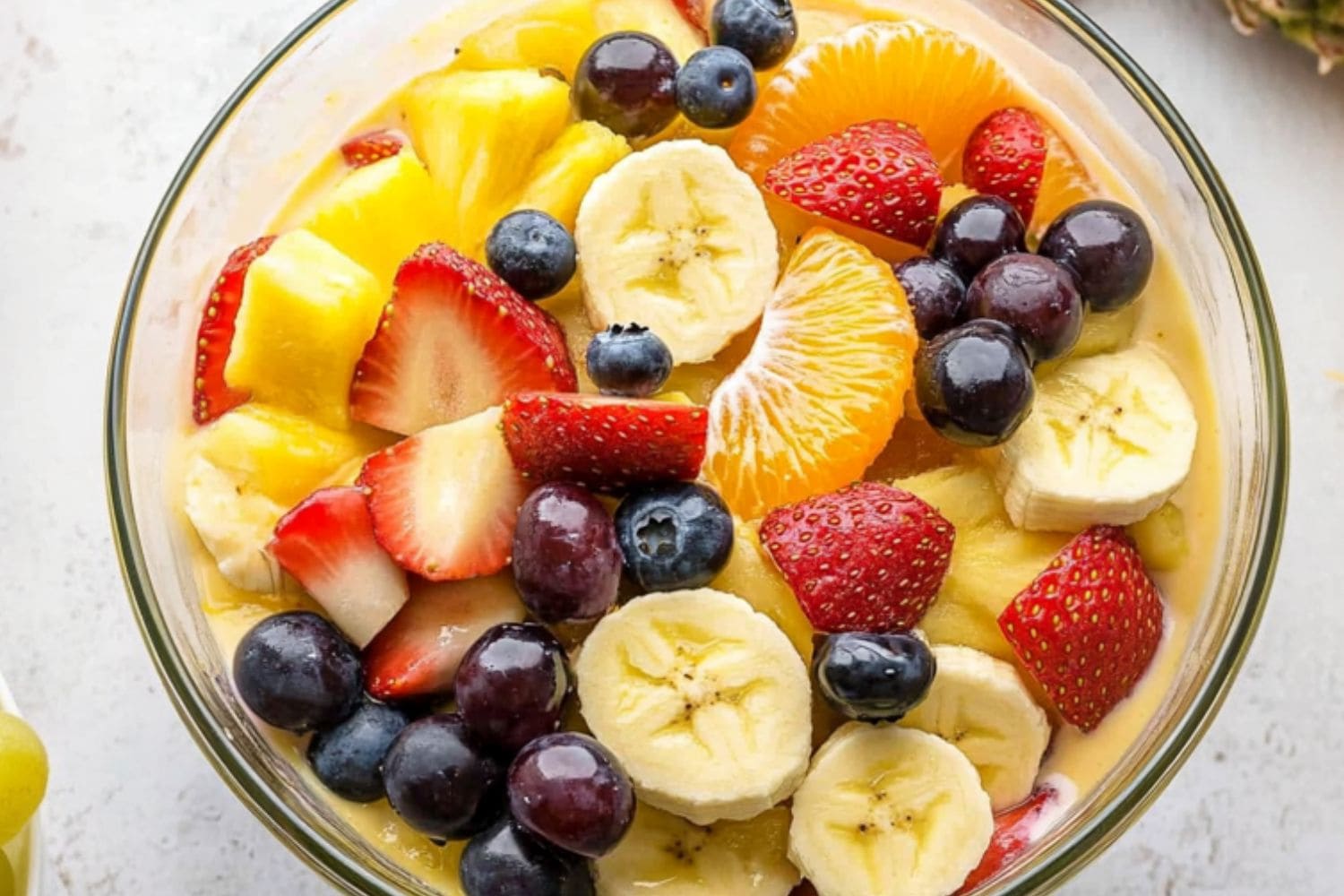 Mixing vanilla pudding with Cool Whip creates a sweet, creamy dressing that transforms ordinary fruit into a crowd-pleasing side dish.