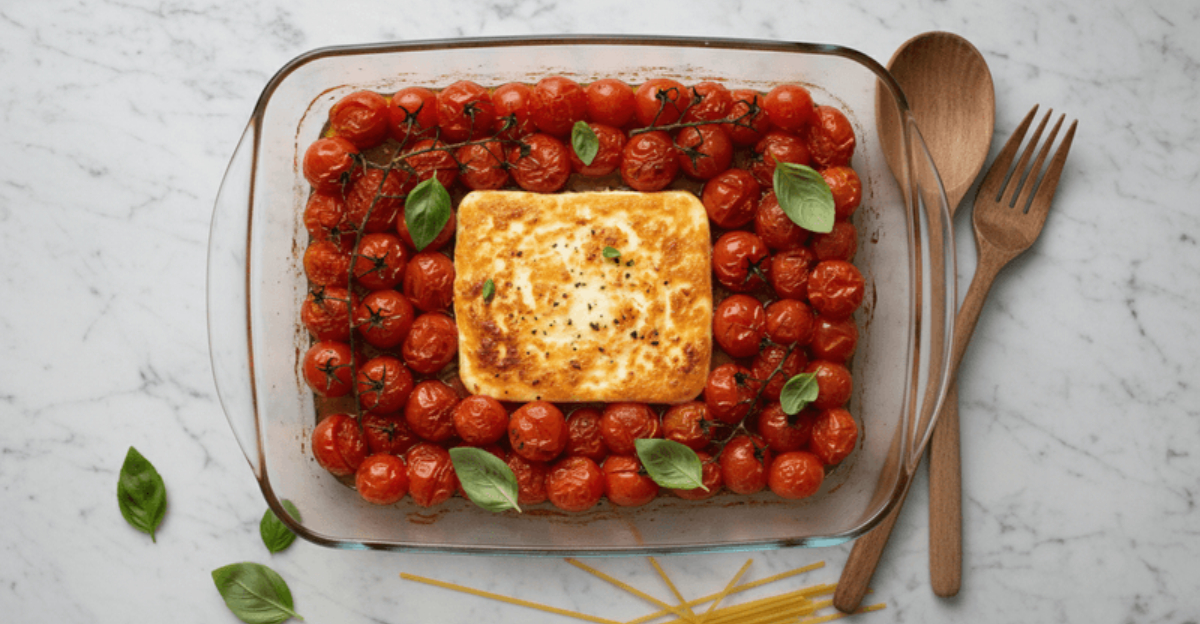 A block of feta cheese sits in the center of a baking dish surrounded by cherry tomatoes, olive oil, garlic, and fresh herbs.