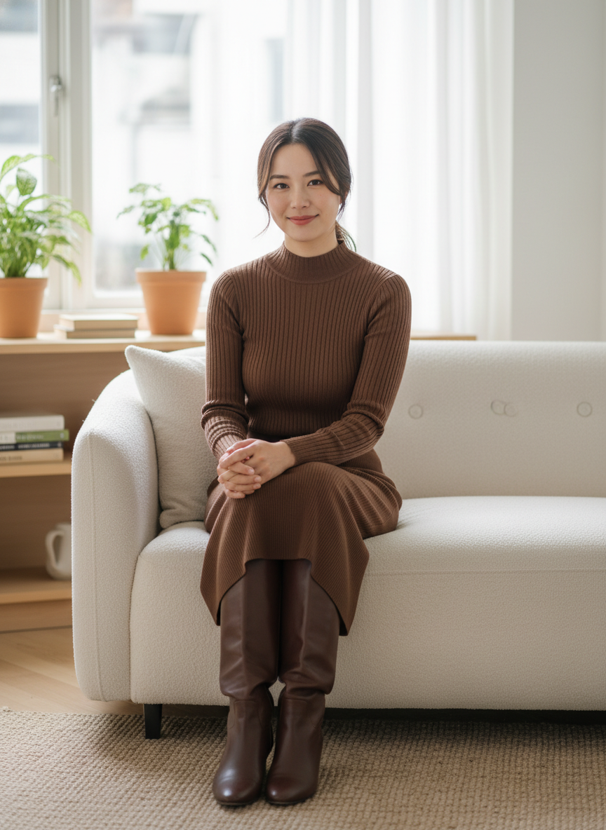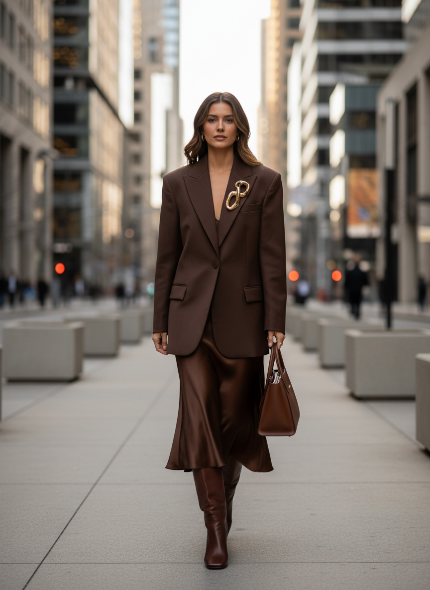 Tall leather boots in a deep tan or matching chocolate shade complete the look, adding a sleek vertical line that makes the whole outfit feel long, lean, and luxurious.