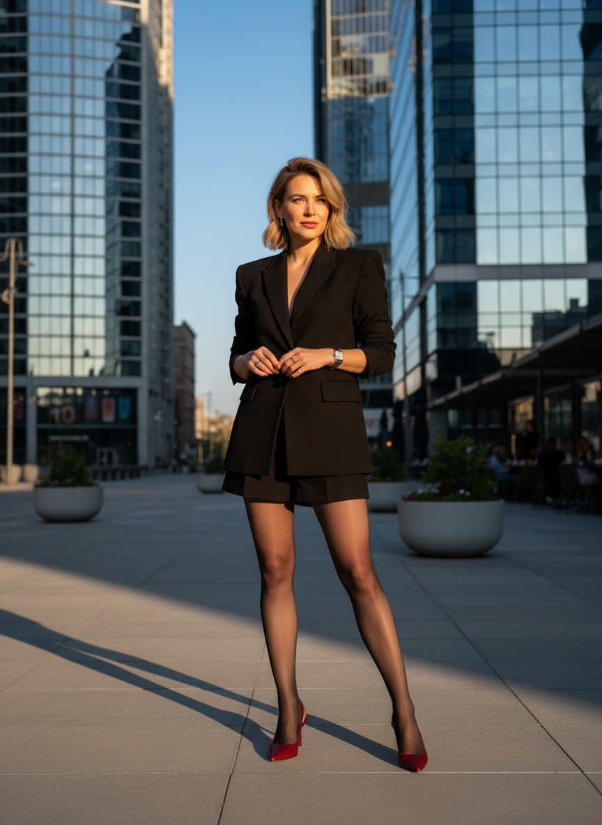 Sheer tights bridge the gap between dressed-up and casual, adding a delicate texture that softens the structured silhouette.