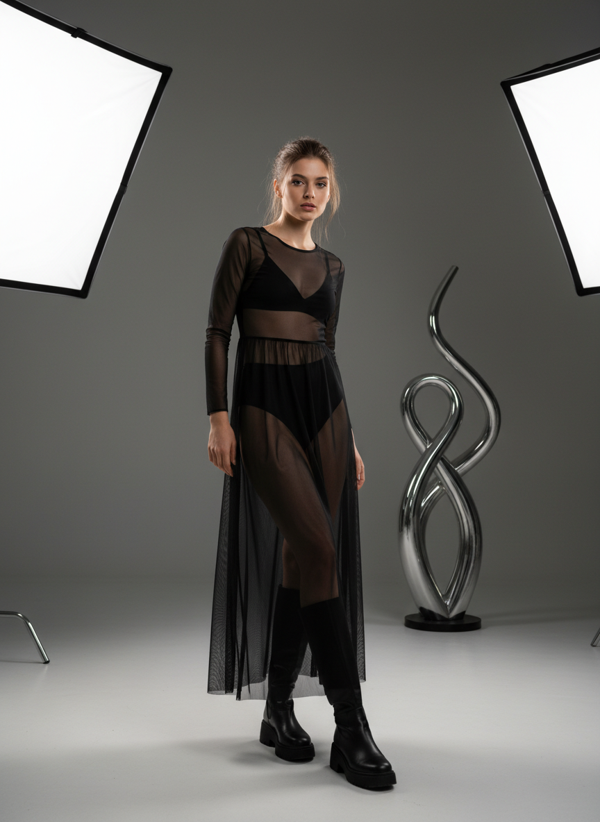 A transparent black maxi dress worn over a minimalist bralette and high-waisted briefs creates a look that feels both daring and surprisingly wearable.