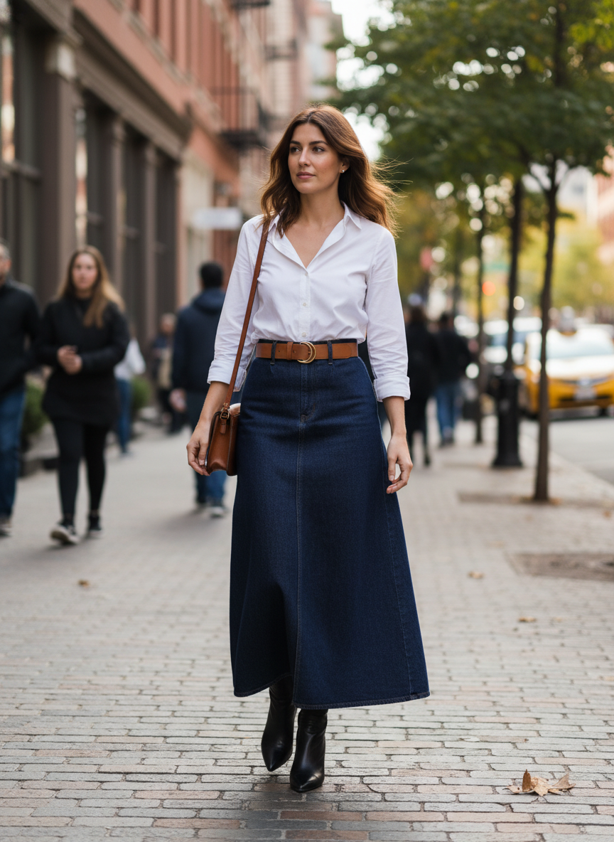 The long dark-wash denim skirt is having a major comeback in 2026, and styling it with a crisp white button-down shirt creates a contrast that feels clean, classic, and effortlessly cool.