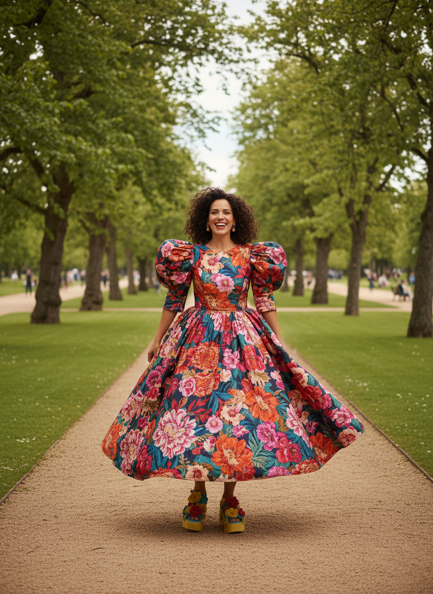 An oversized floral dress with dramatic proportions and vibrant blooms makes an instant statement without needing a single accessory.