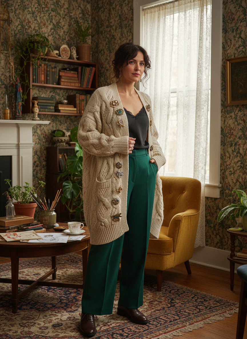 Pinning multiple vintage brooches across a chunky, oversized cardigan creates a look that feels collected, quirky, and deeply personal in the best possible way.