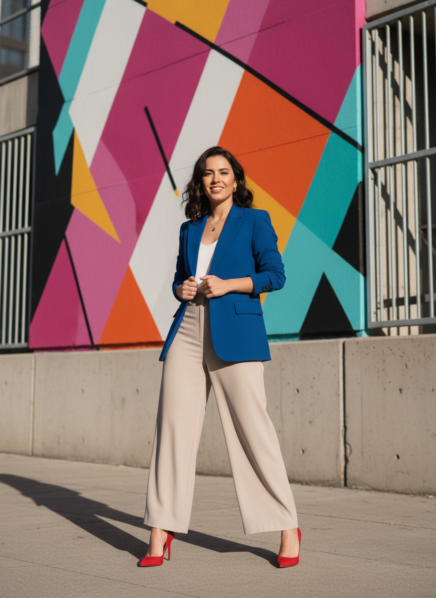 Neutral trousers in a beige or cream tone act as the peacemaker between those two vivid statement pieces, keeping the look balanced rather than chaotic.