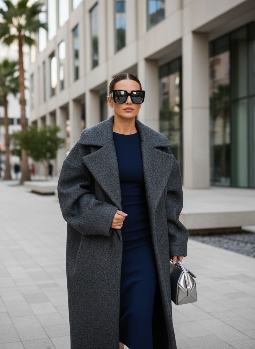 Wearing a dramatic, structured maxi coat over a simple fitted dress lets the coat become the centerpiece of a look that feels runway-ready without requiring much effort underneath.