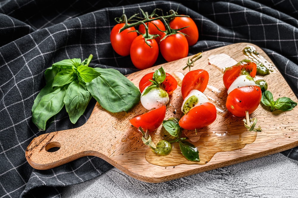 Fresh mozzarella balls, cherry tomatoes, and basil leaves threaded onto toothpicks create a colorful and delicious starter.
