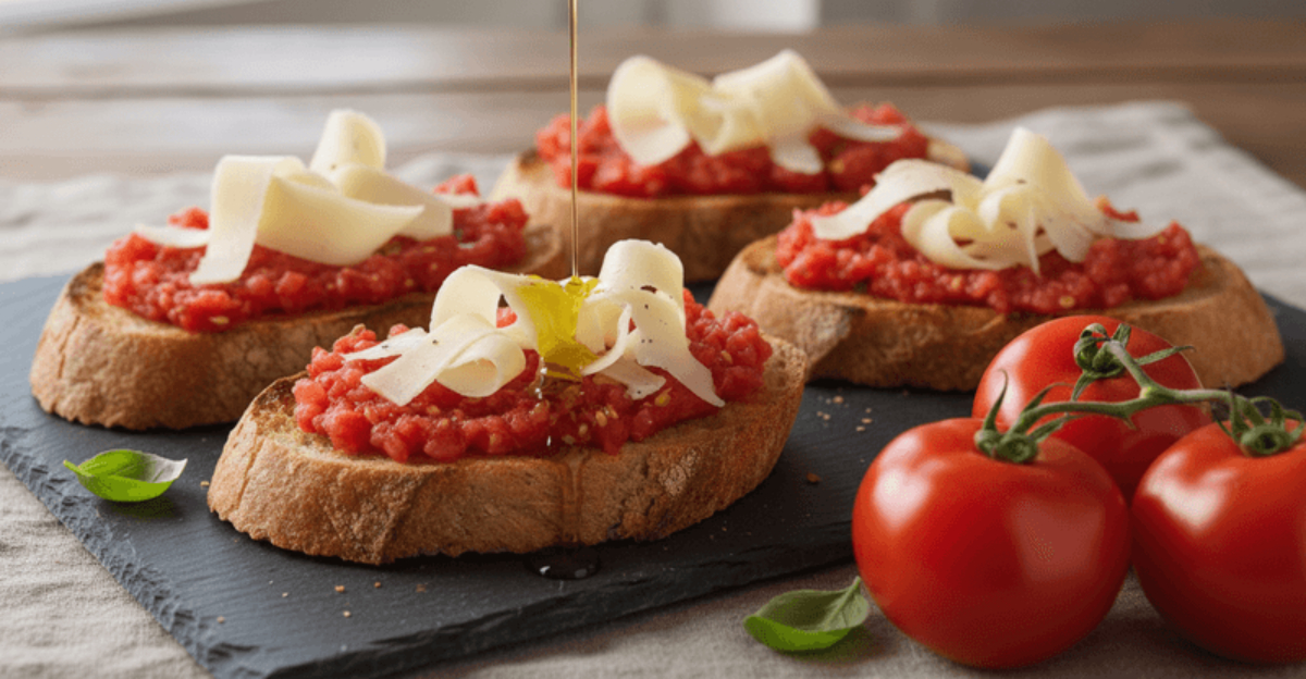 Toasted bread gets rubbed with ripe tomato halves until the pulp soaks in, creating a juicy, flavorful base.