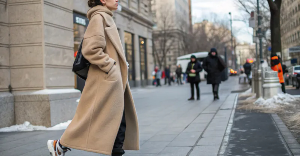 This pairing works especially well when you’re running errands or meeting friends for coffee. The coat keeps you warm and polished, while the sneakers ensure you stay comfortable all day. Add straight-leg jeans or tailored trousers underneath to complete the balanced silhouette that makes this outfit truly shine.