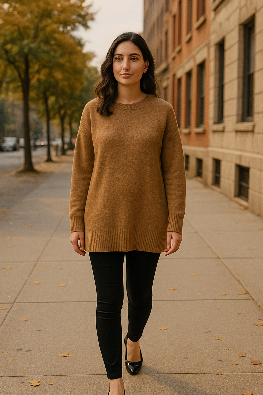 An oversized tunic or long sweater covering two-thirds of your body paired with fitted leggings or slim pants creates contemporary, relaxed elegance.