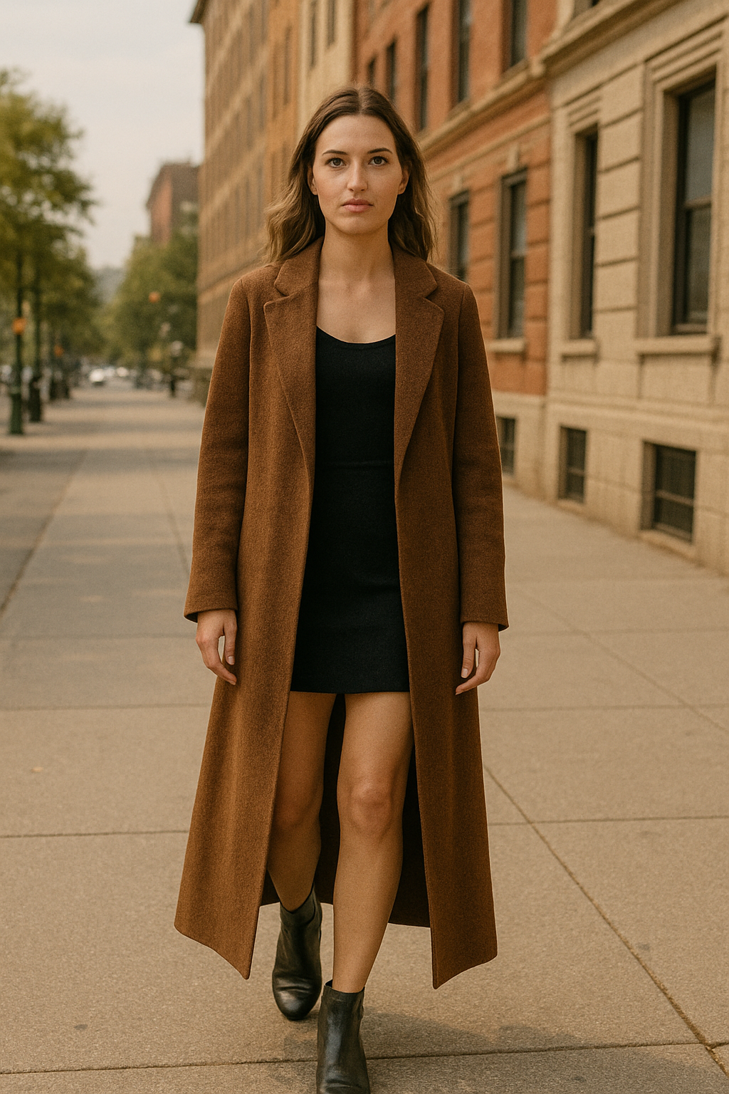Drama arrives when you layer a floor-length coat over a mini dress or shorts.