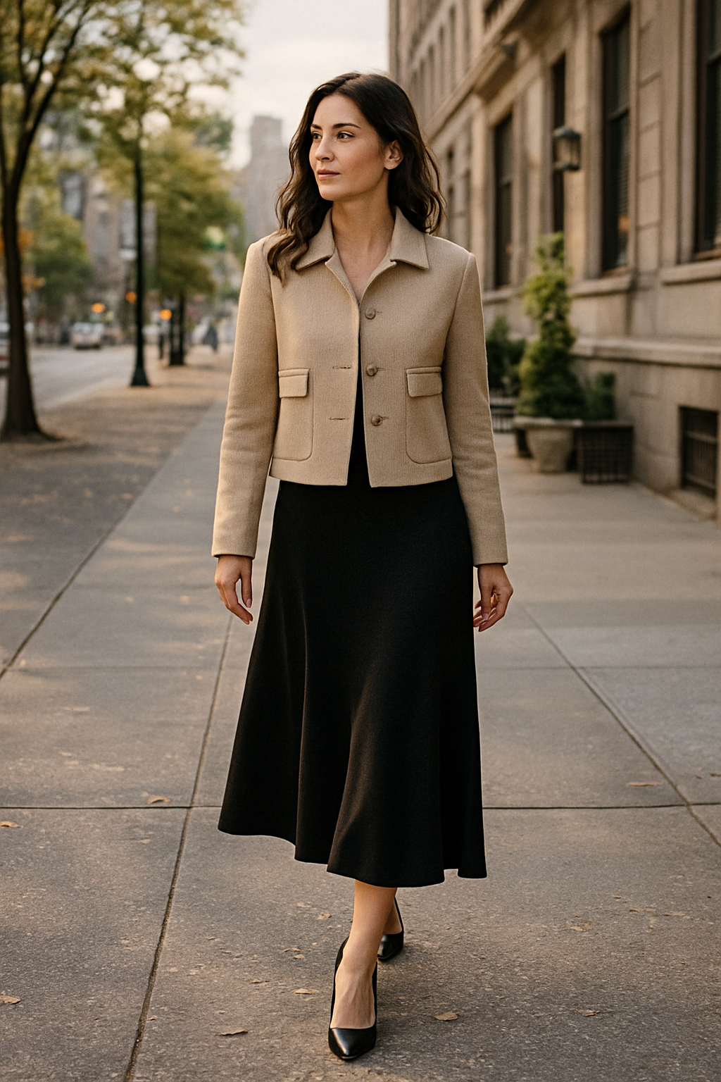 A jacket that ends at your hip paired with a skirt that’s about 1.6 times longer creates this divine proportion.