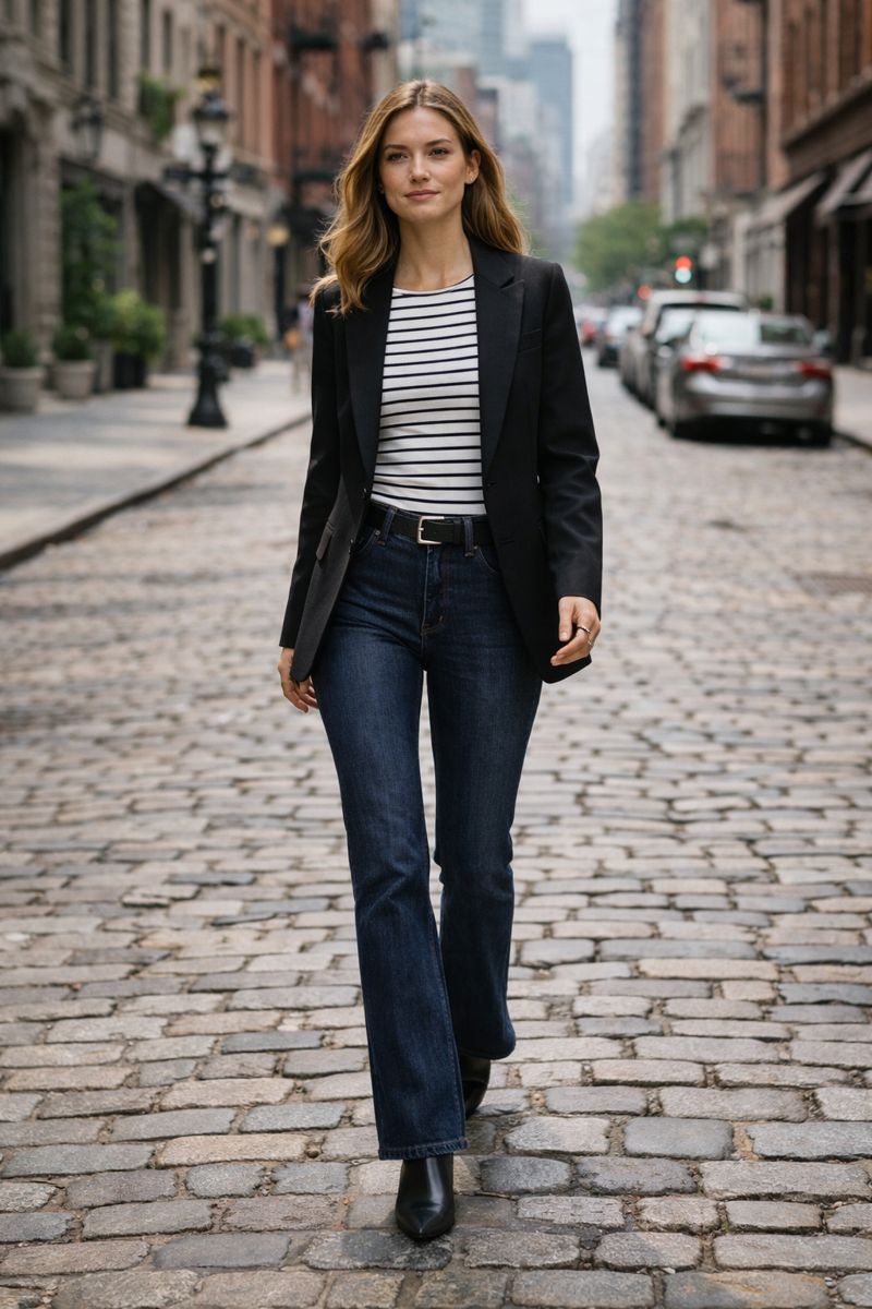 Bootcut jeans paired with a striped long-sleeve tee create that classic French foundation everyone craves.