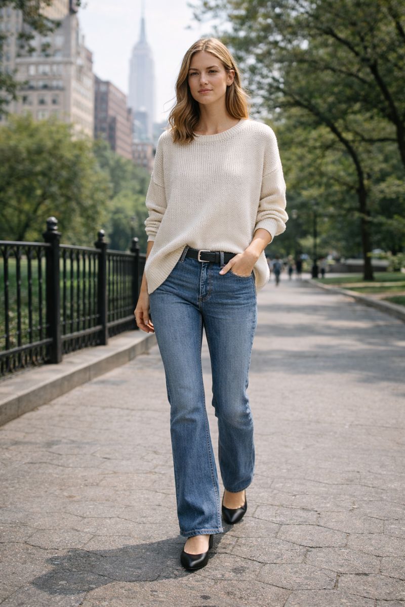 Ballet flats or slim sneakers keep the look grounded and comfortable.