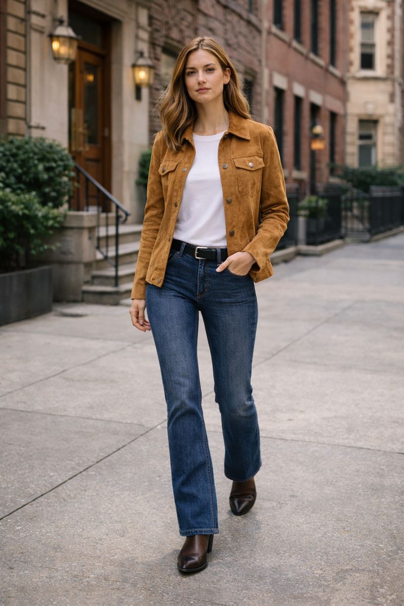 A suede jacket adds texture and warmth, while a simple tee keeps things balanced.