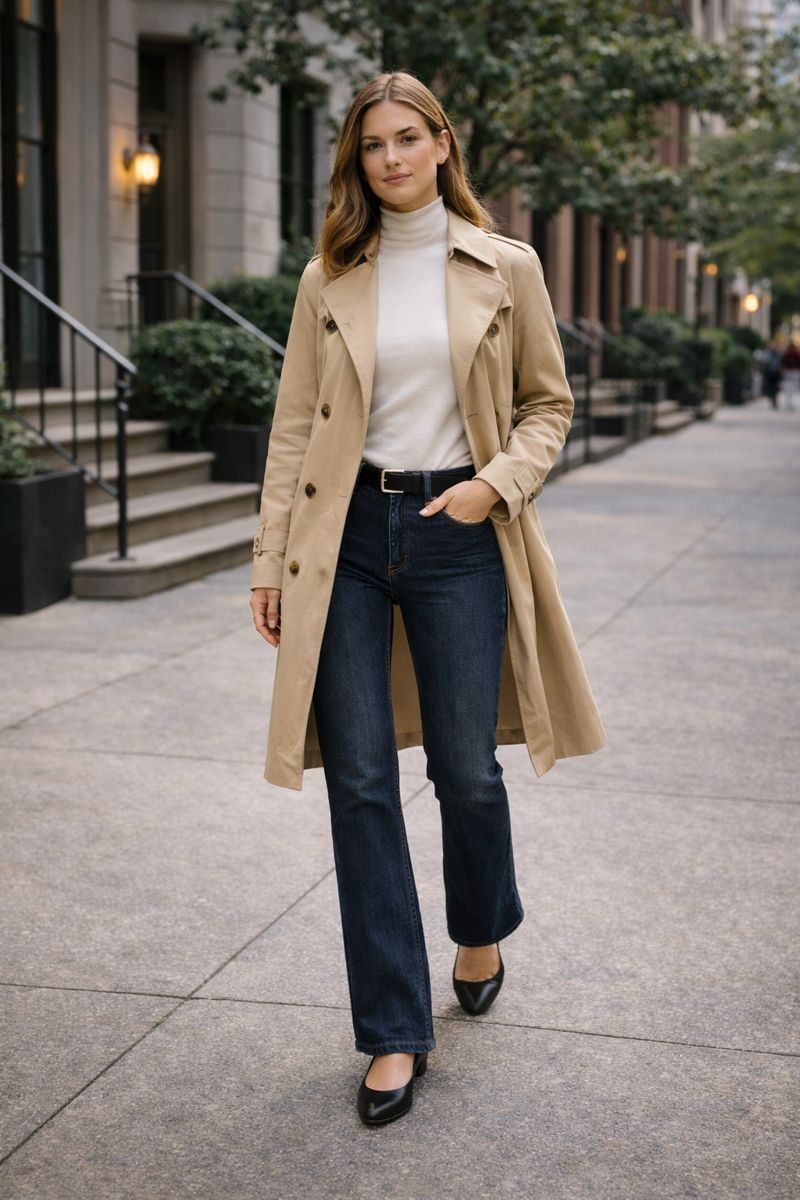 A thin turtleneck adds warmth without bulk underneath a lightweight trench coat.