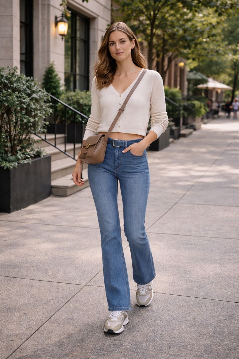 A crisp button-down tucked into structured bootcut jeans creates a professional silhouette that commands respect without trying too hard.