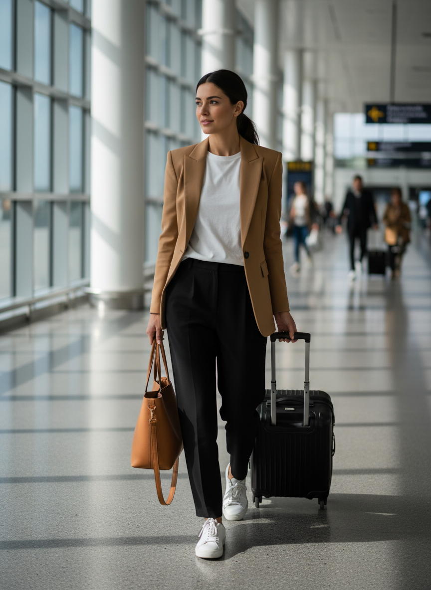 This outfit handles coffee spills and security line stress with grace, making it perfect for travel newbies and veterans alike.