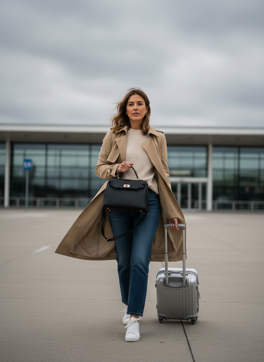 A classic trench coat instantly elevates any travel outfit while providing protection from unexpected showers at your destination.