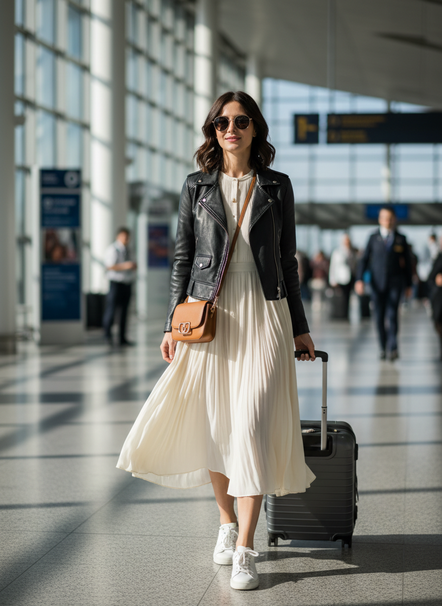 Finish the look with white sneakers or ankle boots for easy movement through terminals.