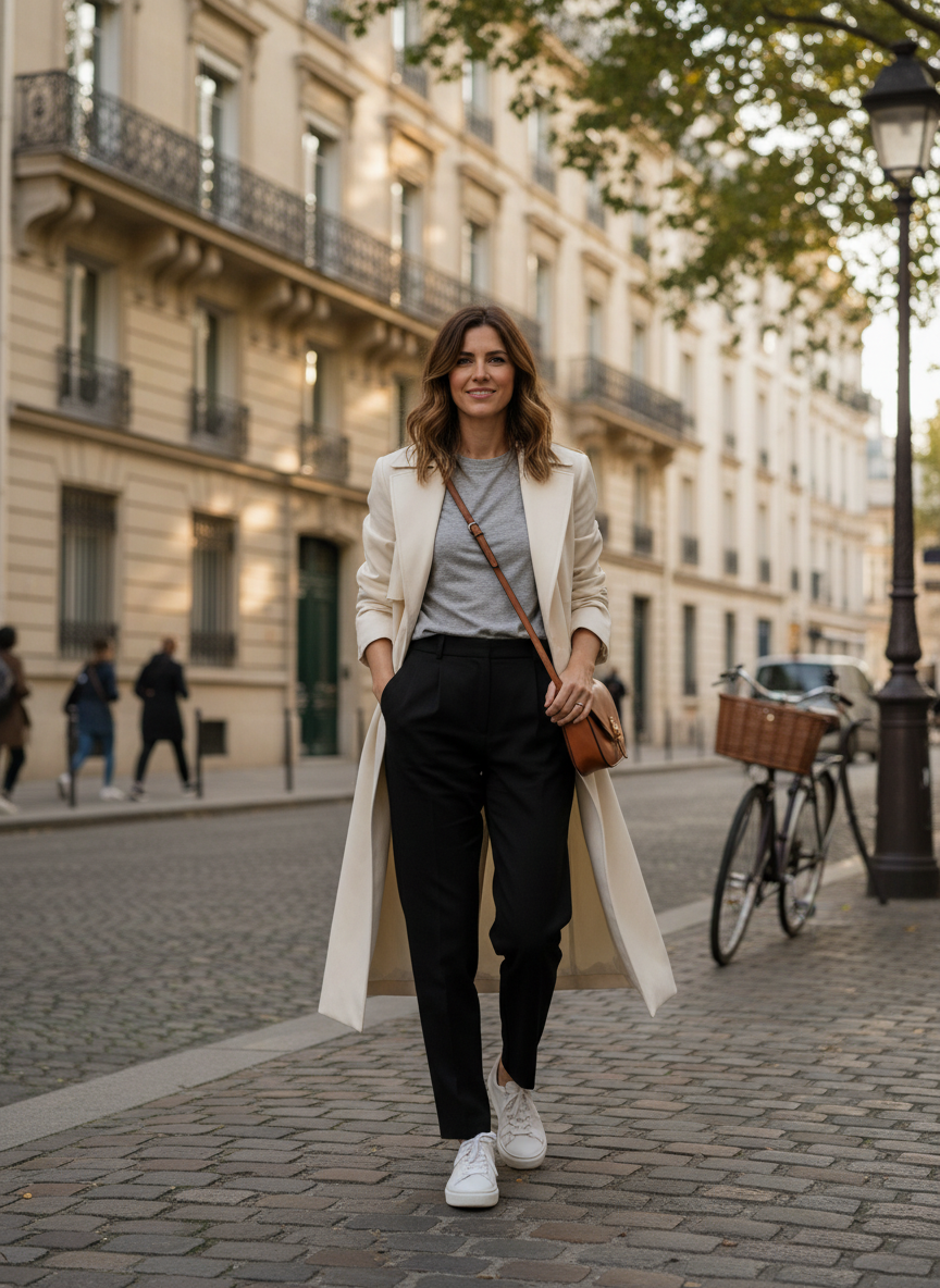 2. Cream Trench Coat + Grey Tee + Tailored Black Trousers + White Sneakers