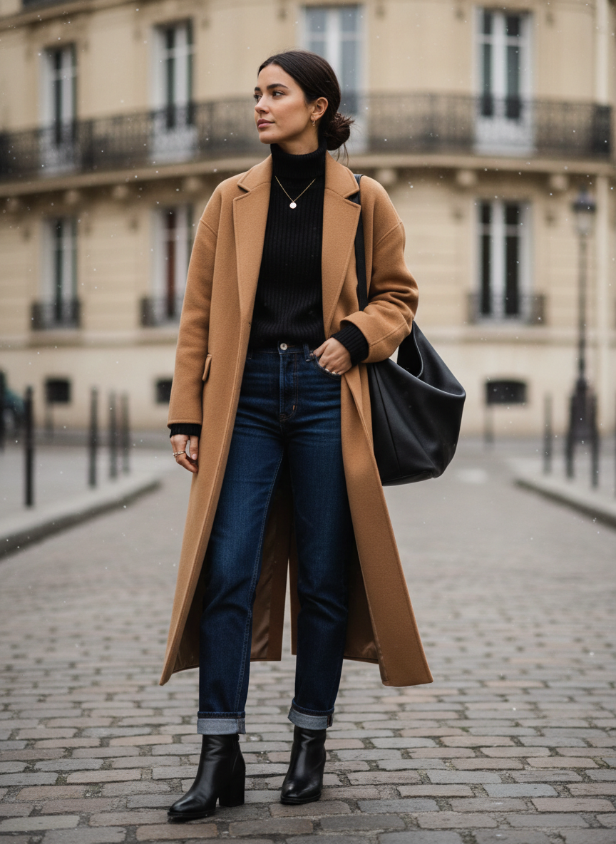 3. Camel Wool Coat + Black Turtleneck + Dark Denim + Ankle Boots