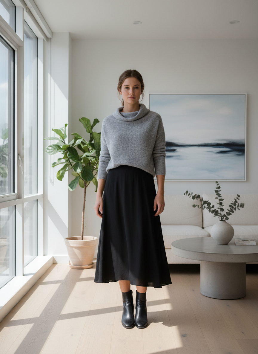 5. Black Midi Skirt + Soft Cashmere Sweater + Low Boots