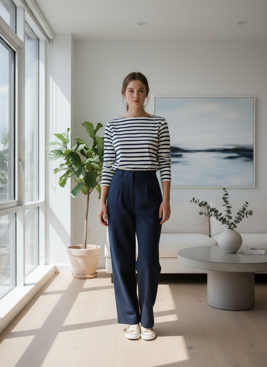 6. Wide-Leg Trousers + Striped Breton Top + Neutral Sneakers