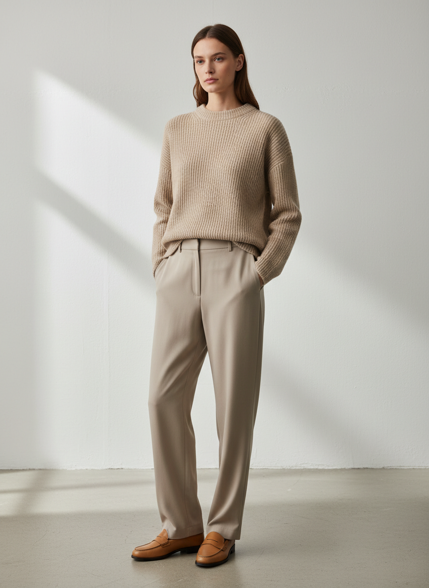 7. Monochrome Beige Set (Knit + Trousers) + Tan Loafers