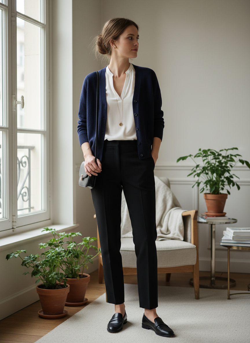 A navy cardigan over black cigarette pants creates a sophisticated color combination that’s dark enough to feel cohesive but not monotonous.