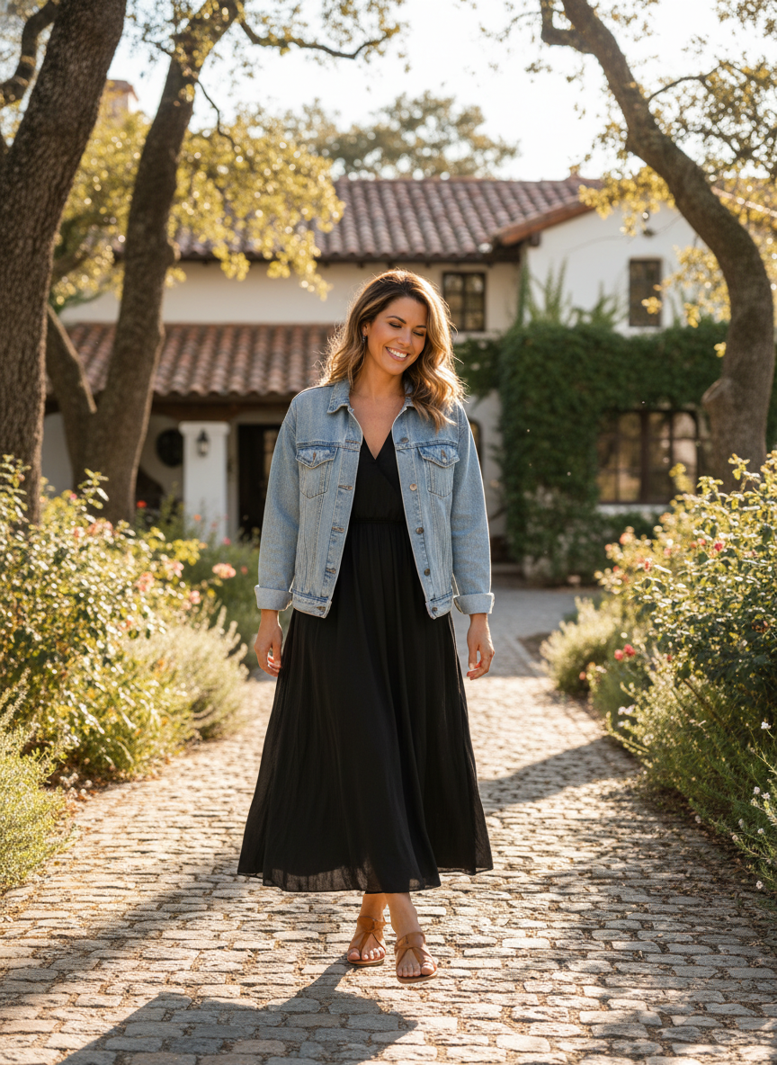 10. Long Black Dress + Denim Jacket + Understated Sandals