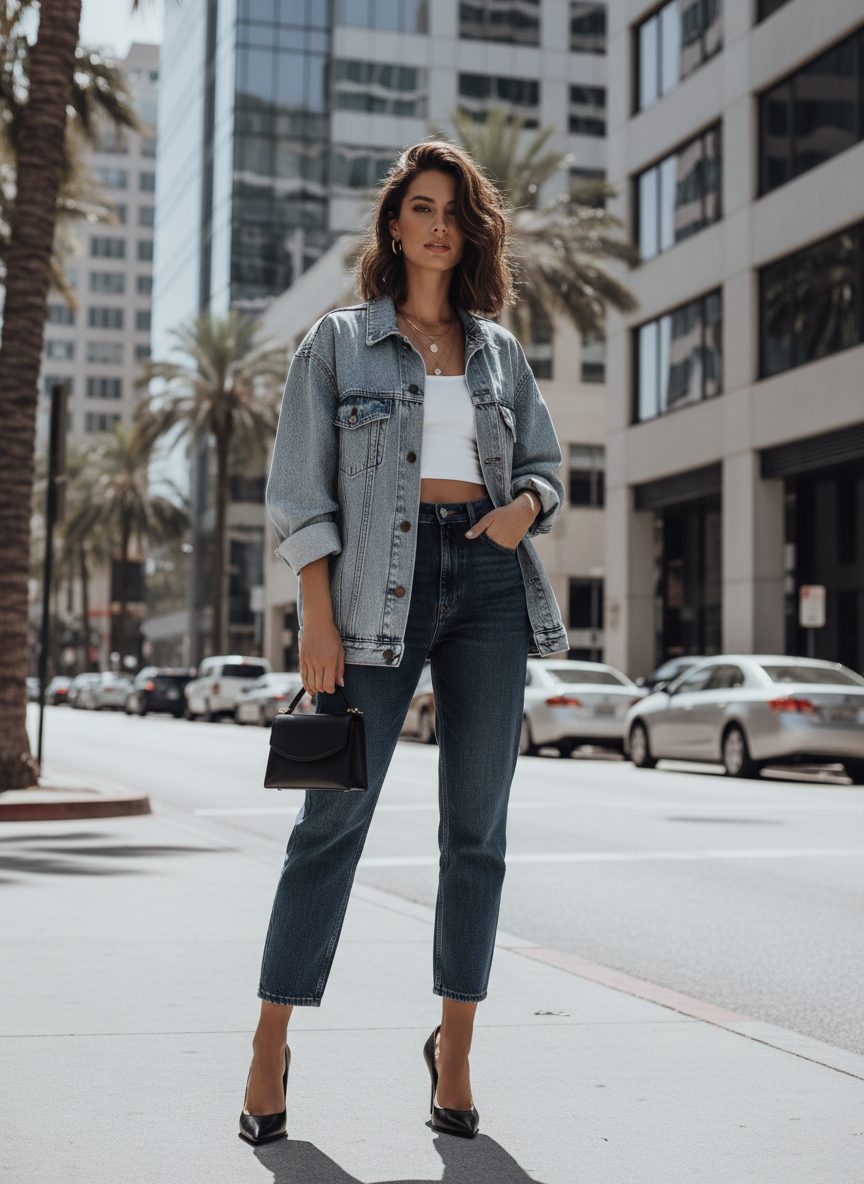 1. Oversized Denim Jacket with Relaxed Straight-Leg Jeans and Pointed-Toe Heels