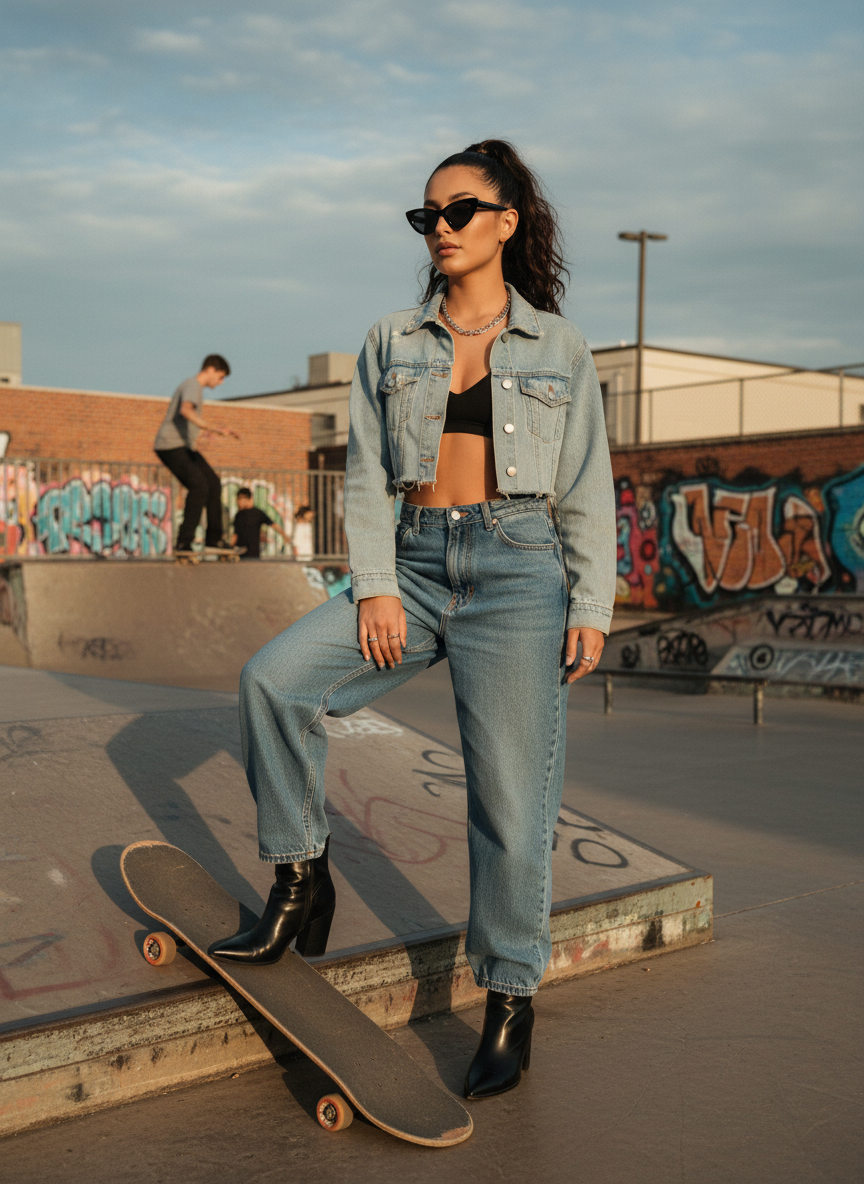 4. Cropped Denim Jacket with Low-Slung Baggy Jeans and Sleek Ankle Boots
