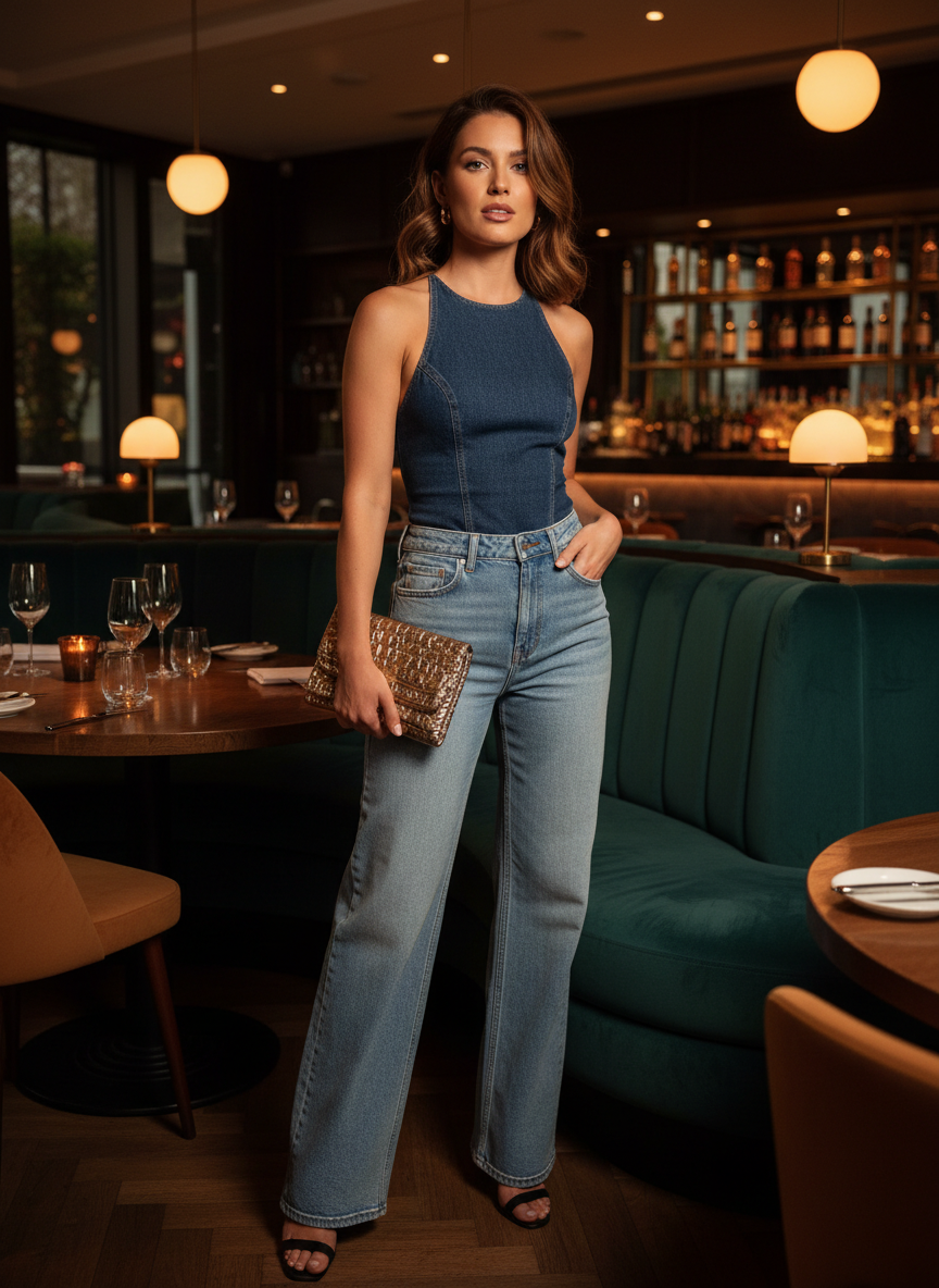 6. Denim Halter Top with Barrel-Leg Jeans and Metallic Clutch