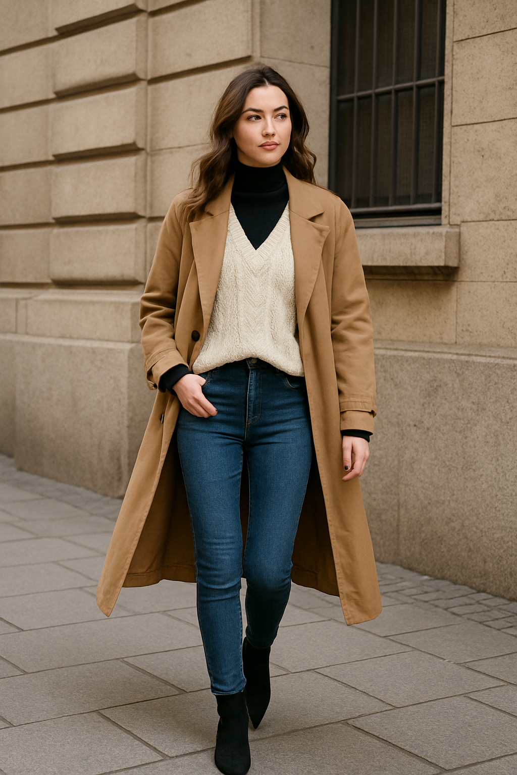 Skinny jeans anchor this entire look, keeping your lower half streamlined while your upper body showcases interesting layers. It’s practical for cold weather and incredibly stylish at the same time.