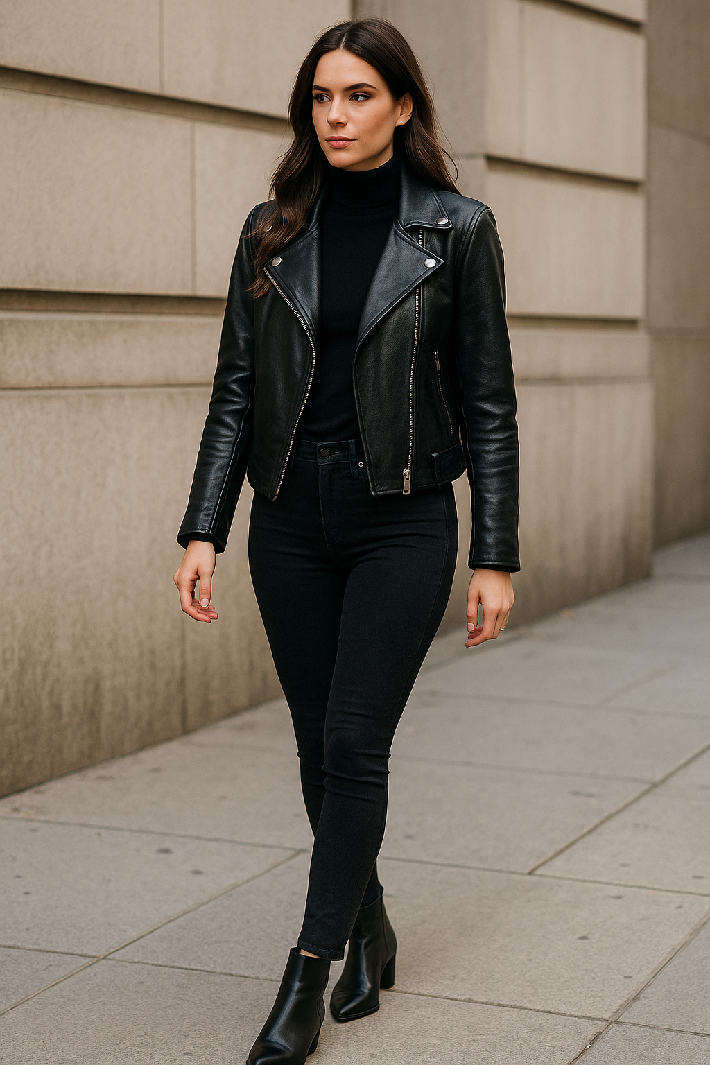 Edgy never goes out of style, especially when you nail the moto jacket and skinny jeans combination. Stylists are upgrading this classic pairing with high-quality leather or suede jackets that feel luxurious rather than costume-y. Sleek ankle boots complete the look, keeping everything transitional and wearable for multiple occasions.