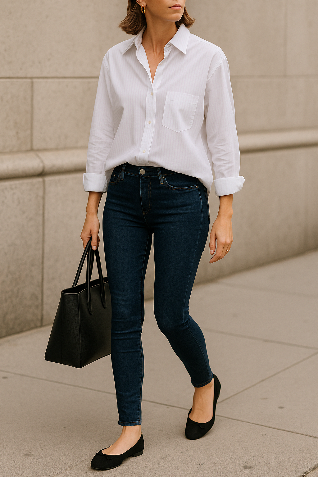 Minimalism meets elegance in this stylist-approved combination. An oversized white or striped button-down paired with skinny jeans creates instant sophistication. Tuck it in fully or do a casual half-tuck—either works beautifully. Ballet flats or Mary Janes add that refined finishing touch without any fuss.
