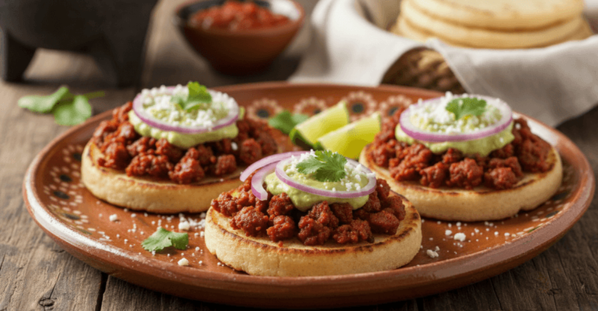 Thick corn cakes get pinched around the edges to create little boats that hold spicy chorizo and toppings without spilling.