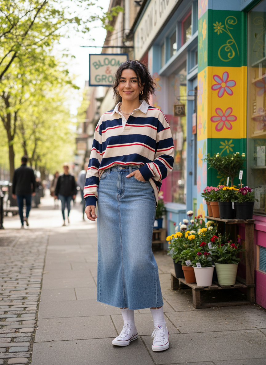 3. Light-Wash Denim Maxi Skirt + Oversized Rugby Shirt + Sneakers + Crew Socks