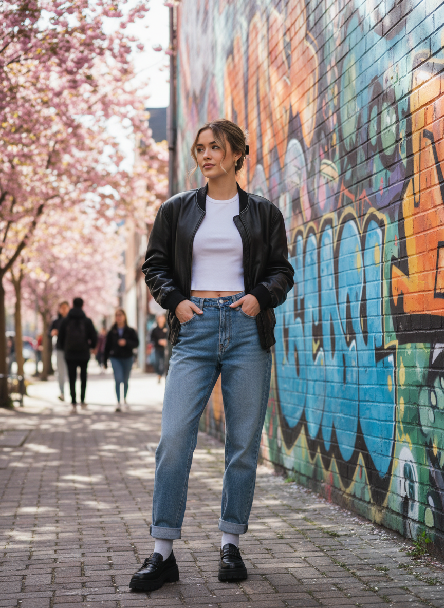 7. Relaxed Denim + Leather Bomber + Baby Tee + Chunky Loafers