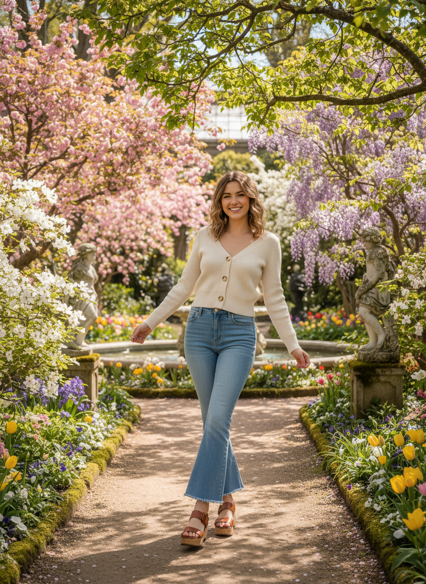 8. Light-Wash Flares + Fitted Cardigan Buttoned as Top + Platform Sandals