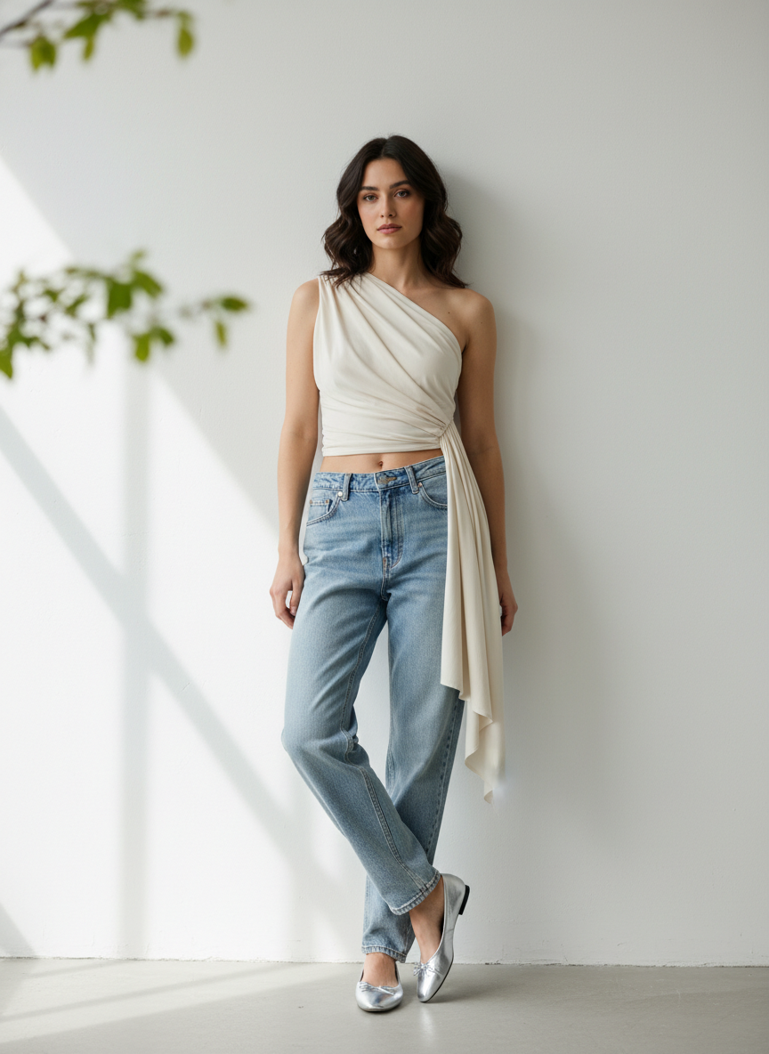 Low-rise denim is back, and pairing it with an asymmetrical top creates a look that feels modern, editorial, and surprisingly wearable.