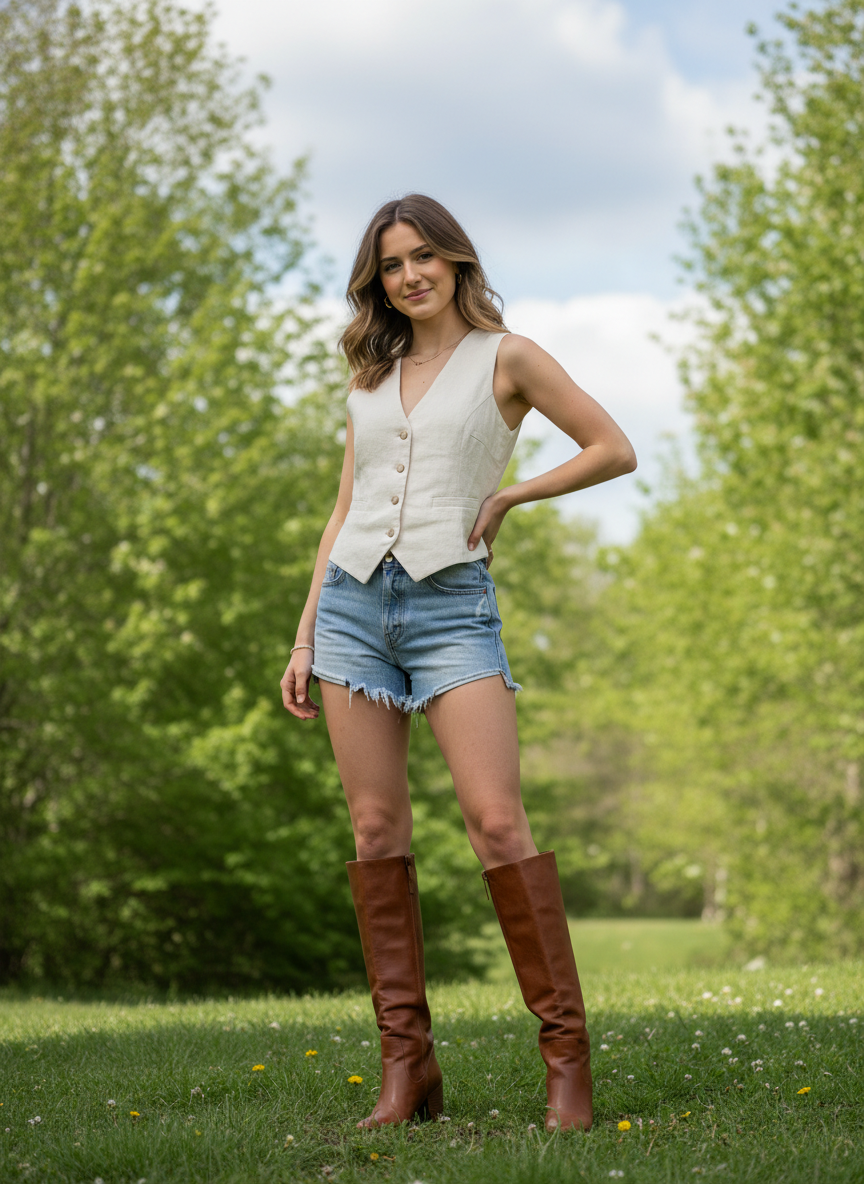 11. Denim Cutoffs + Structured Vest + Tall Boots (Spring Transition Look)