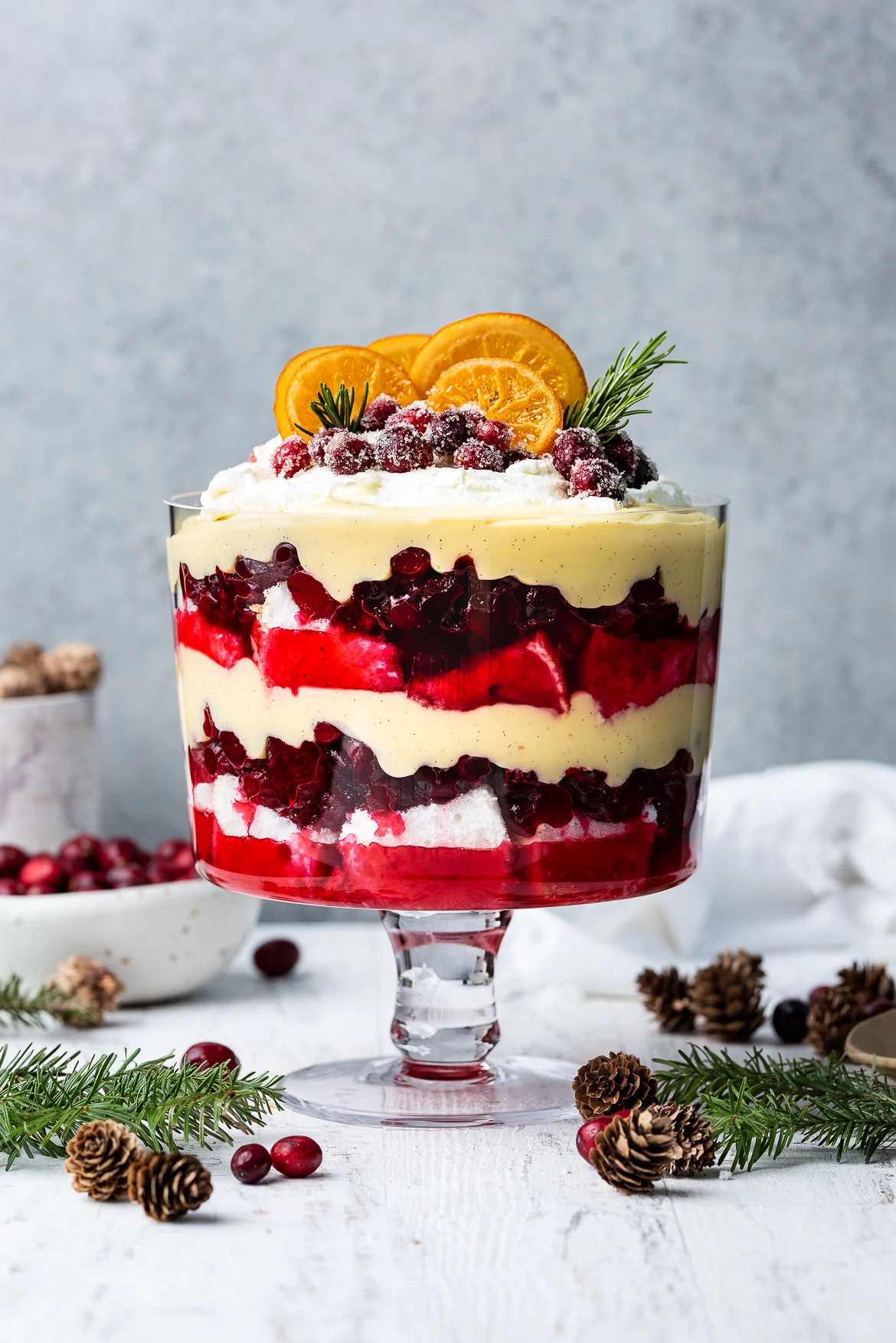 Soft sponge cake soaked in orange juice forms the foundation, then tart cranberry sauce adds bright red color and tangy flavor.