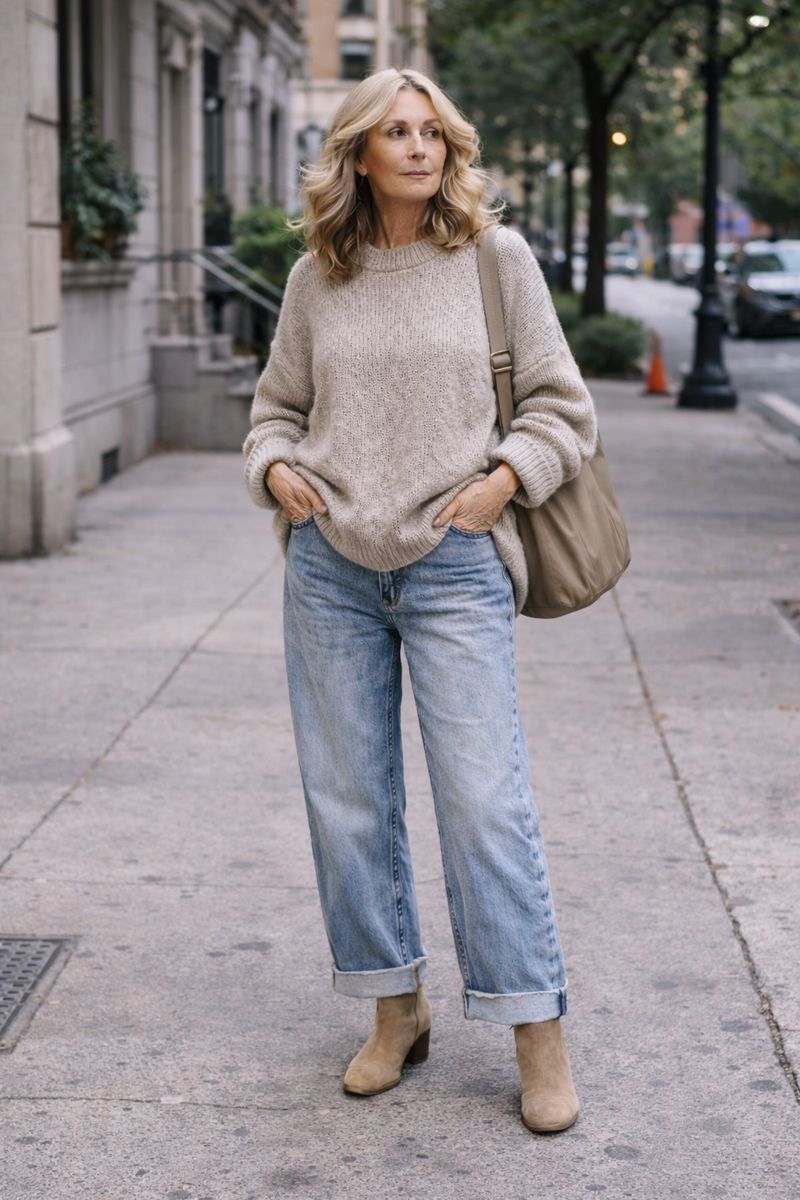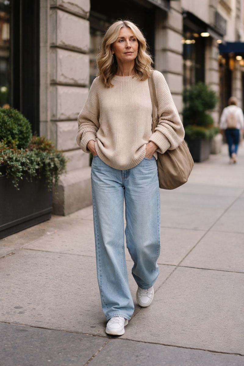 Pairing untailored mom jeans with a baggy, boxy sweater doubles down on the shapeless look, creating an outfit that adds years to your appearance.