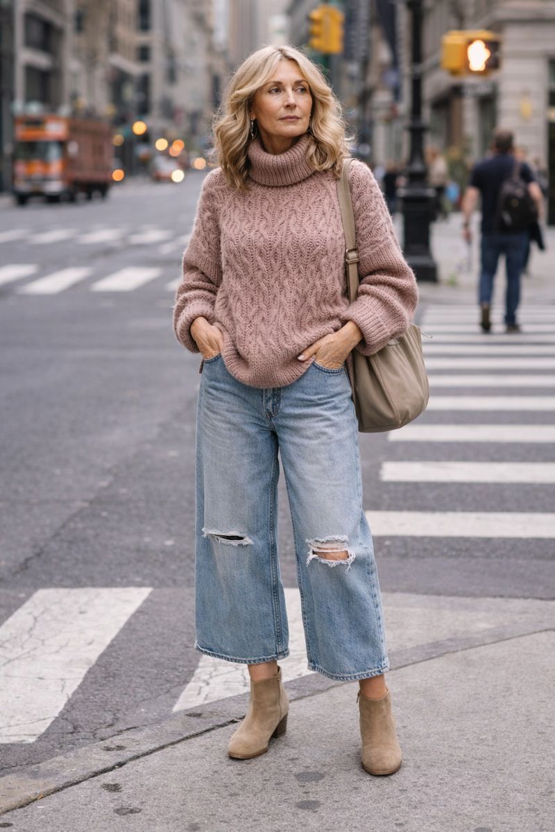 This combination sends mixed signals—the heavy sweater feels mature and cozy, while the ripped jeans try too hard to look youthful and trendy.