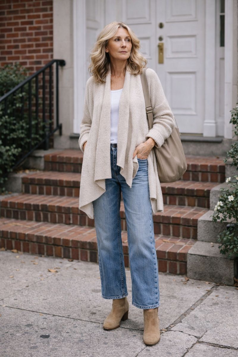 5. Long, Waterfall Cardigan-Style Sweater + Straight Classic Jeans